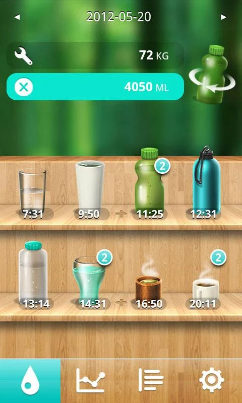 Grafikon jelöli majd, hogy melyik napon hogy teljesítettél, az ajánlottól mennyire tér el pozitív vagy negatív irányba a fogyasztásod. Aztán azt is megnézheted, hogy melyik napon miket ittál (vagyis hány ml-s poharakból hányat). Be lehet állítani, hogy reggel hány órától jelezzen, és este hány óra után ne. Plusz a hangot is be lehet állítani, hogy hangos bugyogással jelezzen, vagy csak rezgéssel.